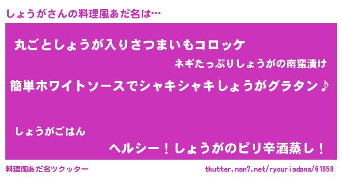 | 男性向けラノベタイトル風あだ名 | 『しょうがの嫁は女の子じゃないと思った?』 |