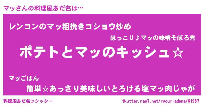| 女子向けラノベタイトル風あだ名 | 『マッの卵を拾いまして』 |