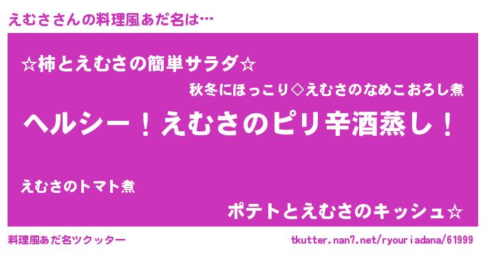 | 男性向けラノベタイトル風あだ名 | 『Re:えむさから始める異世界生活』 |