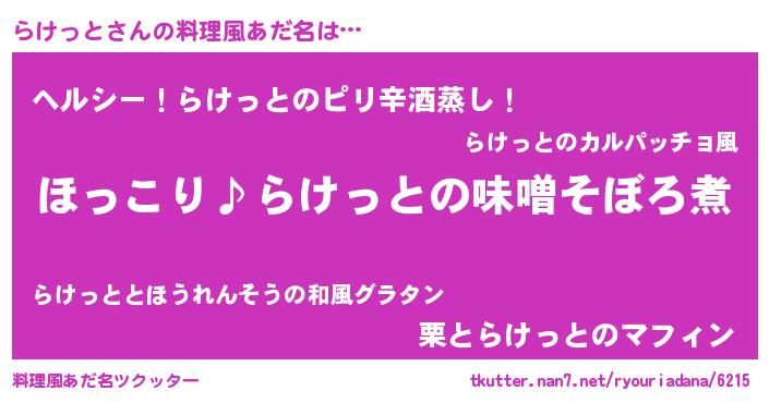 | 男性向けラノベタイトル風あだ名 | 『らけっとの憂鬱』『魔弾の王とらけっと』 |