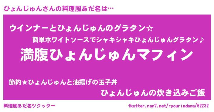 | 男性向けラノベタイトル風あだ名 | 『ひょんじゅんという概念が存在しない退屈な世界 』 |