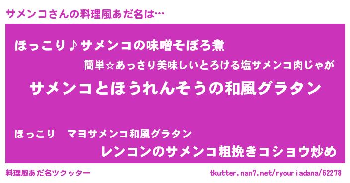 | 意味不明あだ名 | 『もやし科サメンコ属』『自称サメンコ』 |