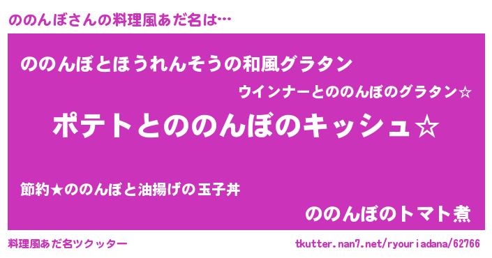 | 女子向けラノベタイトル風あだ名 | 『ののんぼの卵を拾いまして』 |
