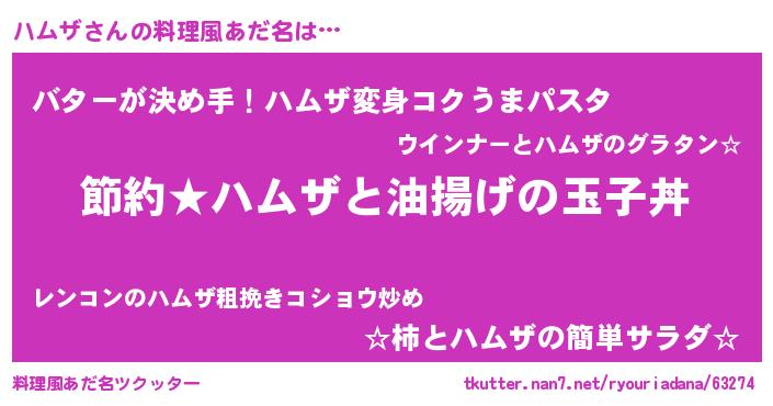 | 女子向けラノベタイトル風あだ名 | 『ハムザ姫と円卓の騎士』『ハムザ恋絵巻』 |