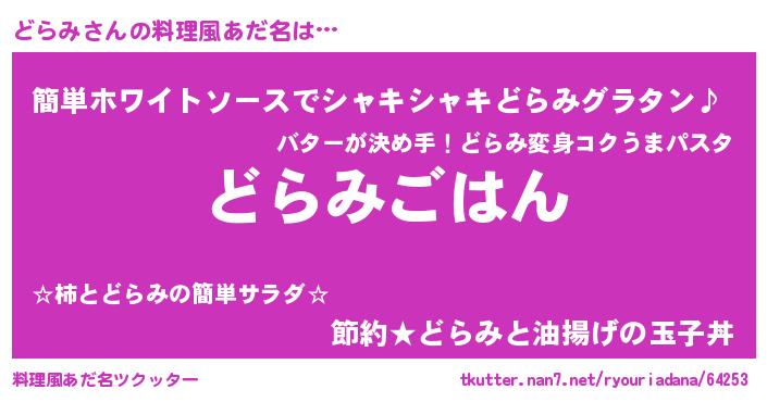 | 意味不明あだ名 | 『なめこ科どらみ属』『ペロリンどらみ』 |