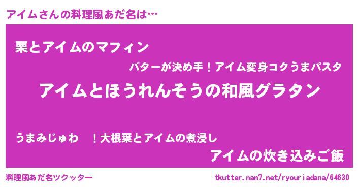 | 女子向けラノベタイトル風あだ名 | 『アイムの玉の輿計画!』『アイム恋絵巻』 |
