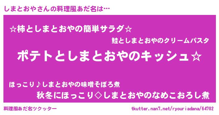 | 女子向けラノベタイトル風あだ名 | 『しまとおやの卵を拾いまして』 |
