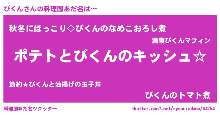 | 男性向けラノベタイトル風あだ名 | 『びくんの嫁は女の子じゃないと思った?』 |