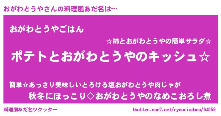 | 男性向けラノベタイトル風あだ名 | 『おがわとうやの嫁は女の子じゃないと思った?』 |