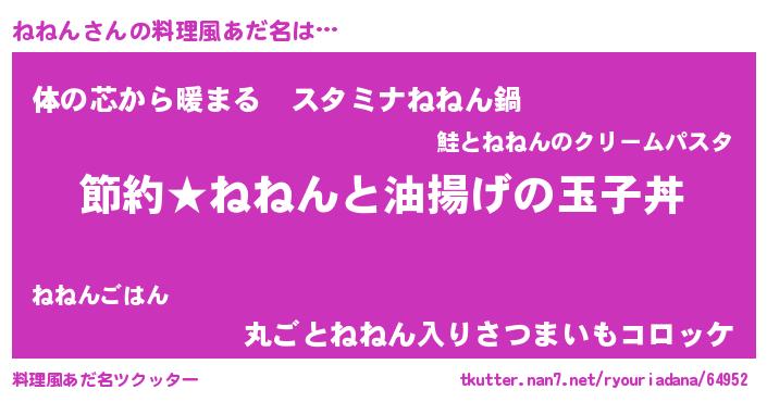 | 男性向けラノベタイトル風あだ名 | 『ねねんの憂鬱』『魔弾の王とねねん』 |