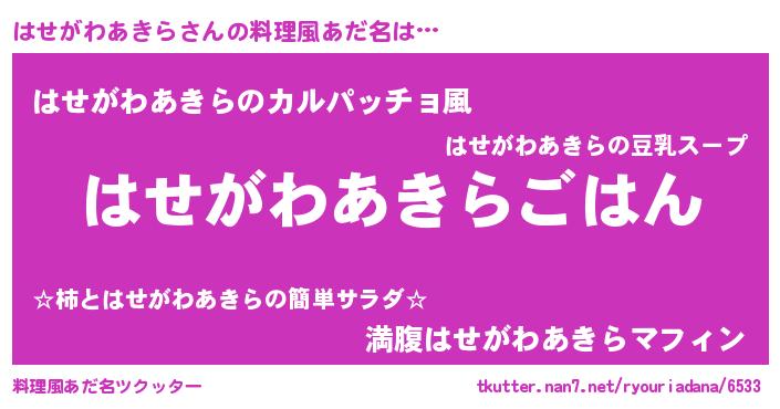 | ヘコむあだ名 | 『はせがわあきら(爆)』『はせぷりん』 |