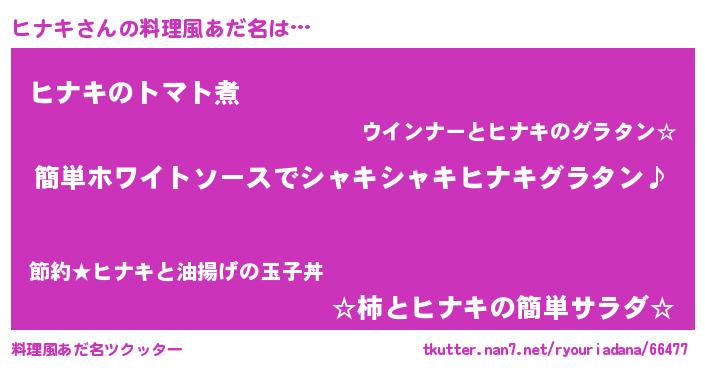 | 男性向けラノベタイトル風あだ名 | 『ヒナキの嫁は女の子じゃないと思った?』 |