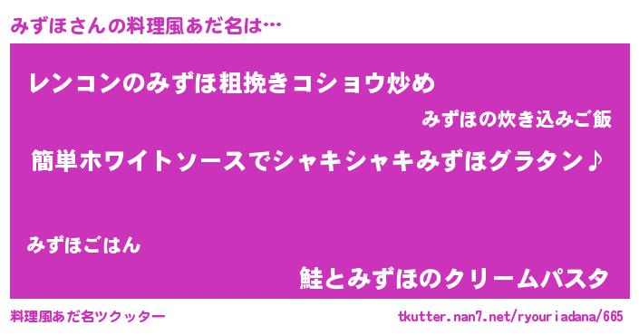 | 女子向けラノベタイトル風あだ名 | 『みずほ様がみてる』『死神みずほの再婚』 |