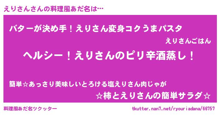 | 男性向けラノベタイトル風あだ名 | 『Re:えりさんから始める異世界生活』 |