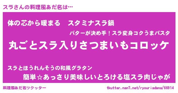 | 意味不明あだ名 | 『住所不定無職スラ(53歳)』『永久保存スラ』 |