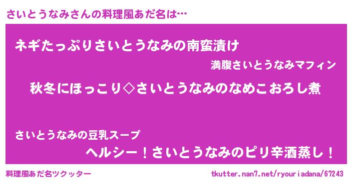 | 男性向けラノベタイトル風あだ名 | 『さいとうなみに滅ぼされるだけの簡単なお仕事です』 |