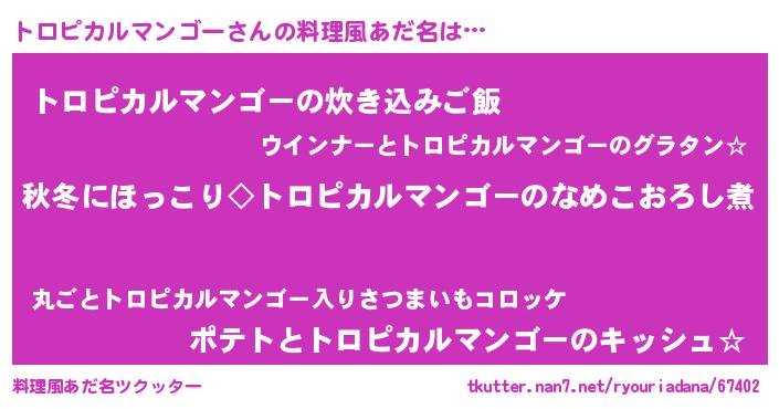 | 男性向けラノベタイトル風あだ名 | 『トロピカルマンゴーに滅ぼされるだけの簡単なお仕事です』 |