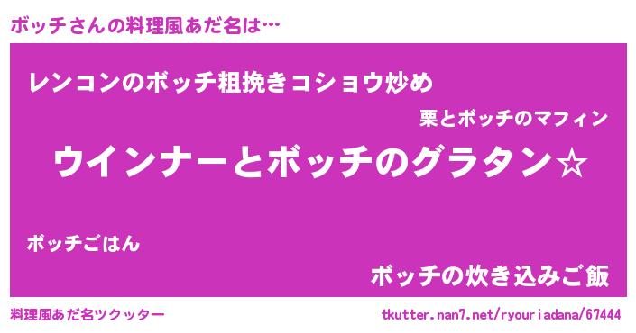 | ヘコむあだ名 | 『なまこ酢』『ボッにー』『ボッを』 |