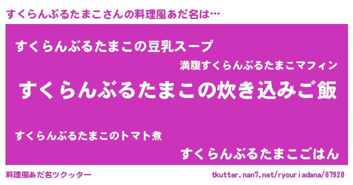 | 男性向けラノベタイトル風あだ名 | 『うちのすくらんぶるたまこが世界を掌握している!』 |