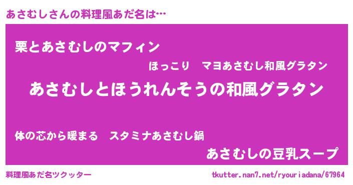 | 男性向けラノベタイトル風あだ名 | 『あさむし~年齢イコール彼女いない歴の魔法使い~』 |