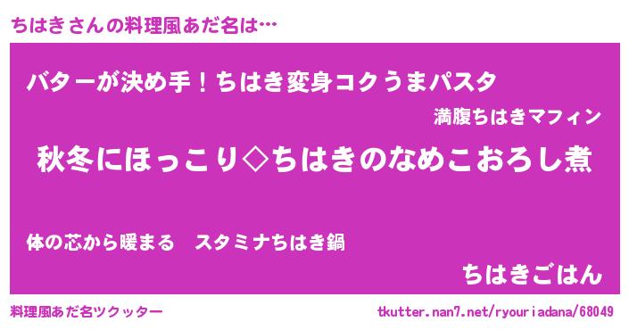 | 男性向けラノベタイトル風あだ名 | 『ちはきに滅ぼされるだけの簡単なお仕事です』 |