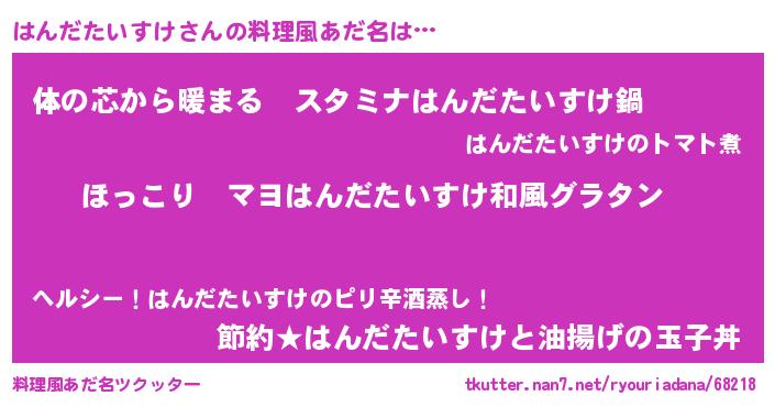 | 男性向けラノベタイトル風あだ名 | 『この素晴らしい世界にはんだたいすけを!』 |