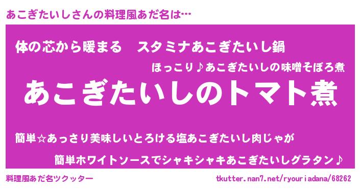 | 男性向けラノベタイトル風あだ名 | 『おまえをオタクにしてやるから、俺をあこぎたいしにしてくれ! 』 |