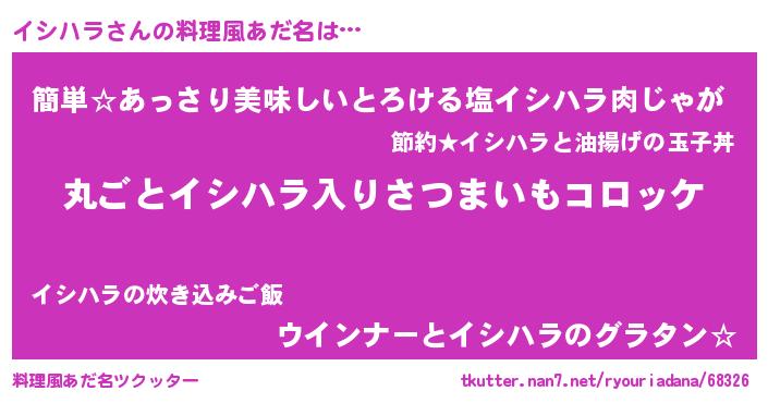| 女子向けラノベタイトル風あだ名 | 『乙女ゲームの破滅フラグしかない悪役イシハラに転生してしまった…』 |