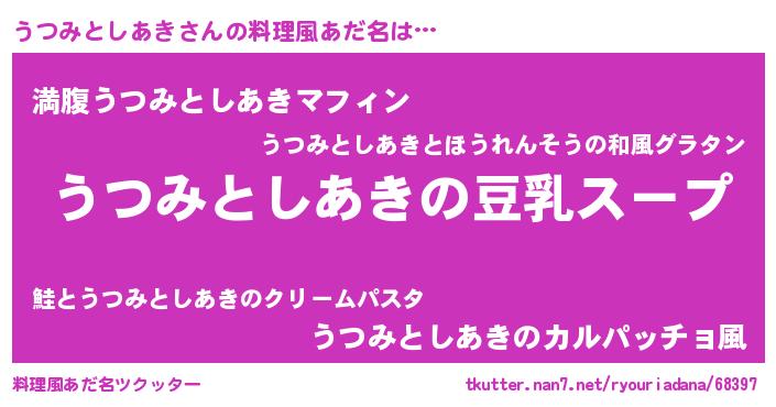 | 可愛いあだ名 | 『うっつぃー』『うつみとしあきママ』 |