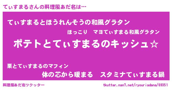 | 女子向けラノベタイトル風あだ名 | 『てぃすまるの卵を拾いまして』 |