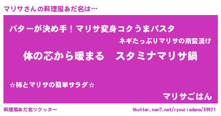 | 女子向けラノベタイトル風あだ名 | 『マリサの雑貨屋さん』『マリサ恋絵巻』 |