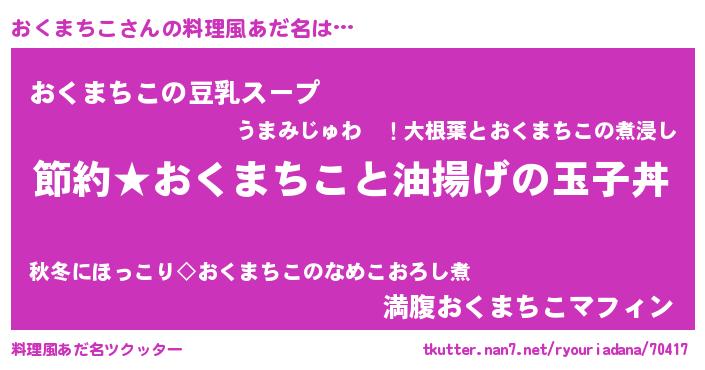 | 女子向けラノベタイトル風あだ名 | 『おくまちこ姫と円卓の騎士』 |