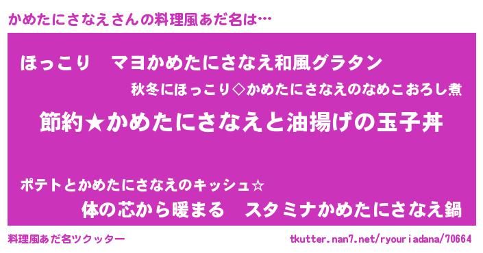 | 男性向けラノベタイトル風あだ名 | 『カメタニサナエアートオンライン』 |