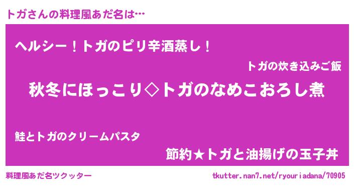 | 男性向けラノベタイトル風あだ名 | 『トガに滅ぼされるだけの簡単なお仕事です』 |