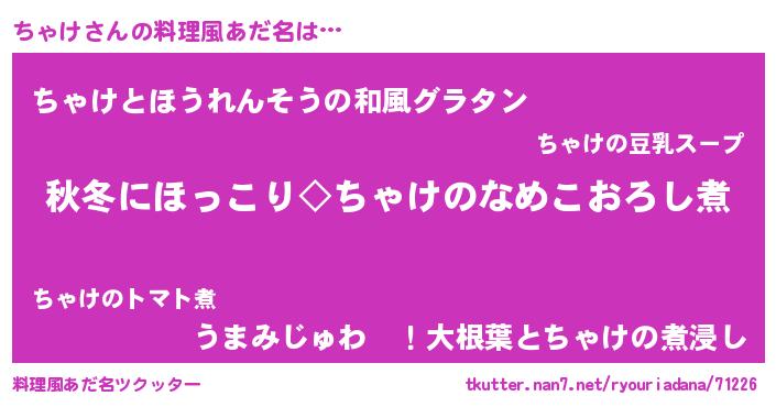 | 男性向けラノベタイトル風あだ名 | 『ちゃけに滅ぼされるだけの簡単なお仕事です』 |