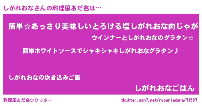 | 男性向けラノベタイトル風あだ名 | 『しがれおなの嫁は女の子じゃないと思った?』 |