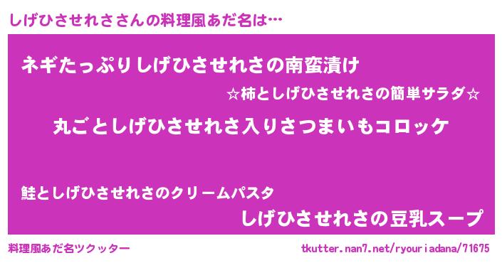 | 男性向けラノベタイトル風あだ名 | 『魔弾の王としげひさせれさ』 |