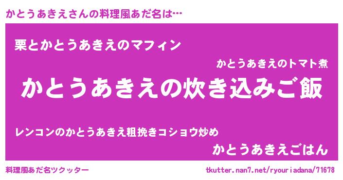| 男性向けラノベタイトル風あだ名 | 『うちのかとうあきえが世界を掌握している!』 |