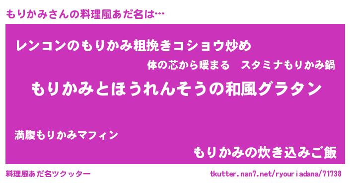| 男性向けラノベタイトル風あだ名 | 『もりかみ~年齢イコール彼女いない歴の魔法使い~』 |