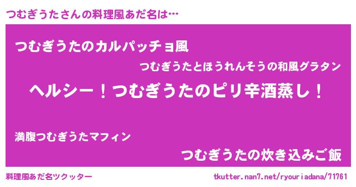 | 意味不明あだ名 | 『自称つむぎうた』『永久保存つむぎうた』 |