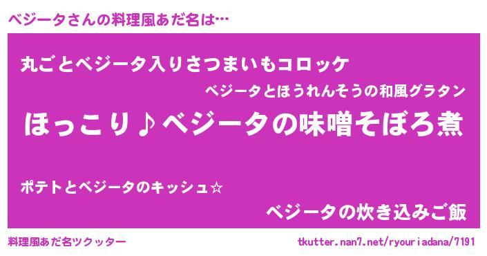 | 男性向けラノベタイトル風あだ名 | 『べジータの憂鬱』『魔弾の王とべジータ』 |