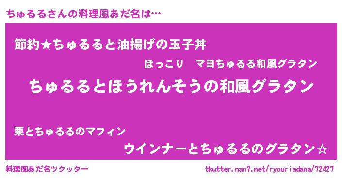 | 女子向けラノベタイトル風あだ名 | 『ちゅるるの玉の輿計画!』 |