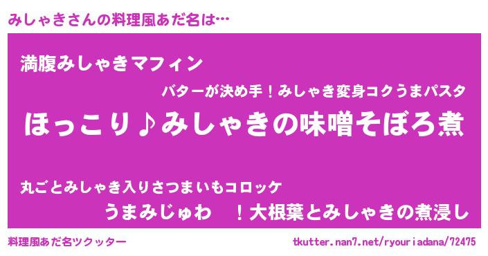 | 男性向けラノベタイトル風あだ名 | 『みしゃきの憂鬱』『魔弾の王とみしゃき』 |
