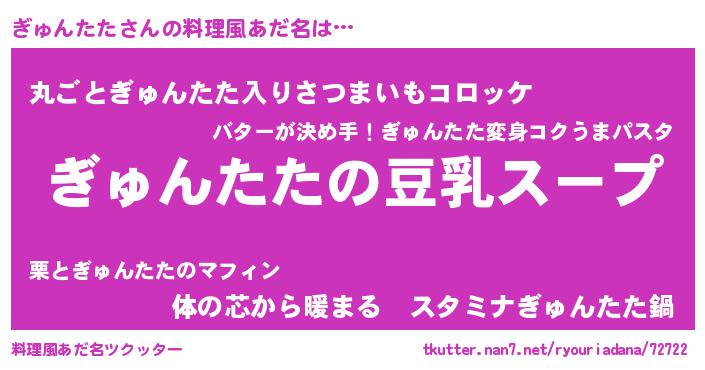 | 胡散臭い通販商品みたいなあだ名 | 『信頼と実績のサプリメント…その名も「ぎゅんたた」』 |