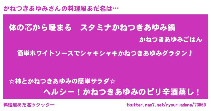 | 男性向けラノベタイトル風あだ名 | 『かねつきあゆみの嫁は女の子じゃないと思った?』 |