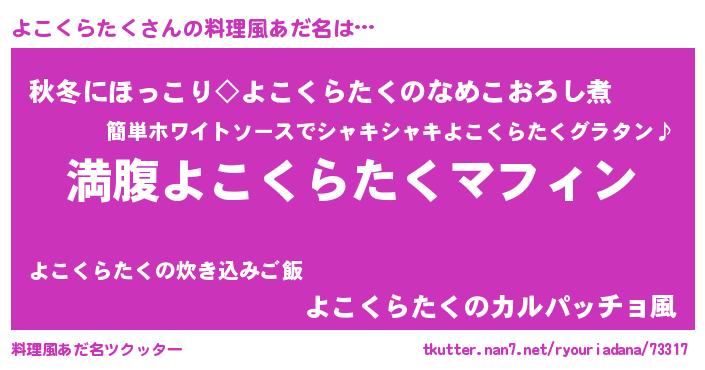 | 男性向けラノベタイトル風あだ名 | 『よこくらたくという概念が存在しない退屈な世界 』 |