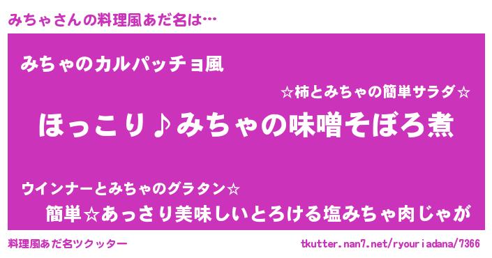 | 男性向けラノベタイトル風あだ名 | 『みちゃの憂鬱』『魔弾の王とみちゃ』 |