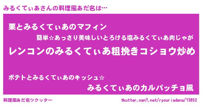 | 胡散臭い通販商品みたいなあだ名 | 『ガンによく効くアガリクス…その名も「みるくてぃあ」』 |