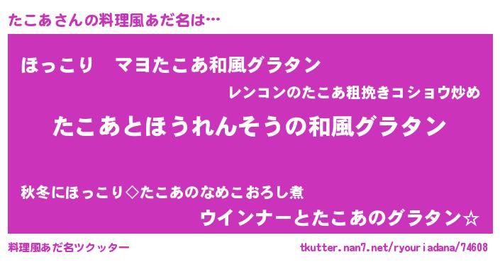 | 女子向けラノベタイトル風あだ名 | 『たこあの玉の輿計画!』 |