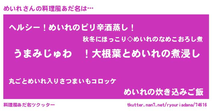 | ヘコむあだ名 | 『レバニラ』『めいれ(爆)』『めいを』 |